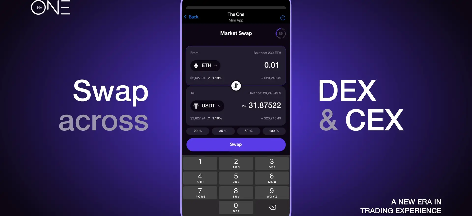 The One is a cutting-edge Telegram MiniApp that revolutionizes crypto trading through seamless access to both CEX and DEX liquidity in a single, automated interface. It enables users to swap any token in one click while offering the best possible rates without requiring users to learn about spreads, slippage, or routing complexity. With its zero-fee trading model and intuitive UX, it stands out as the first and only CEDEX aggregator, merging centralized and decentralized trading experiences.