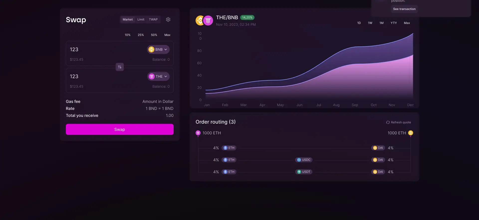 - Seamless Token Swaps: THENA enables users to trade a wide variety of cryptocurrencies with minimal slippage and competitive fees. The platform’s high liquidity ensures that trades are executed quickly and efficiently.