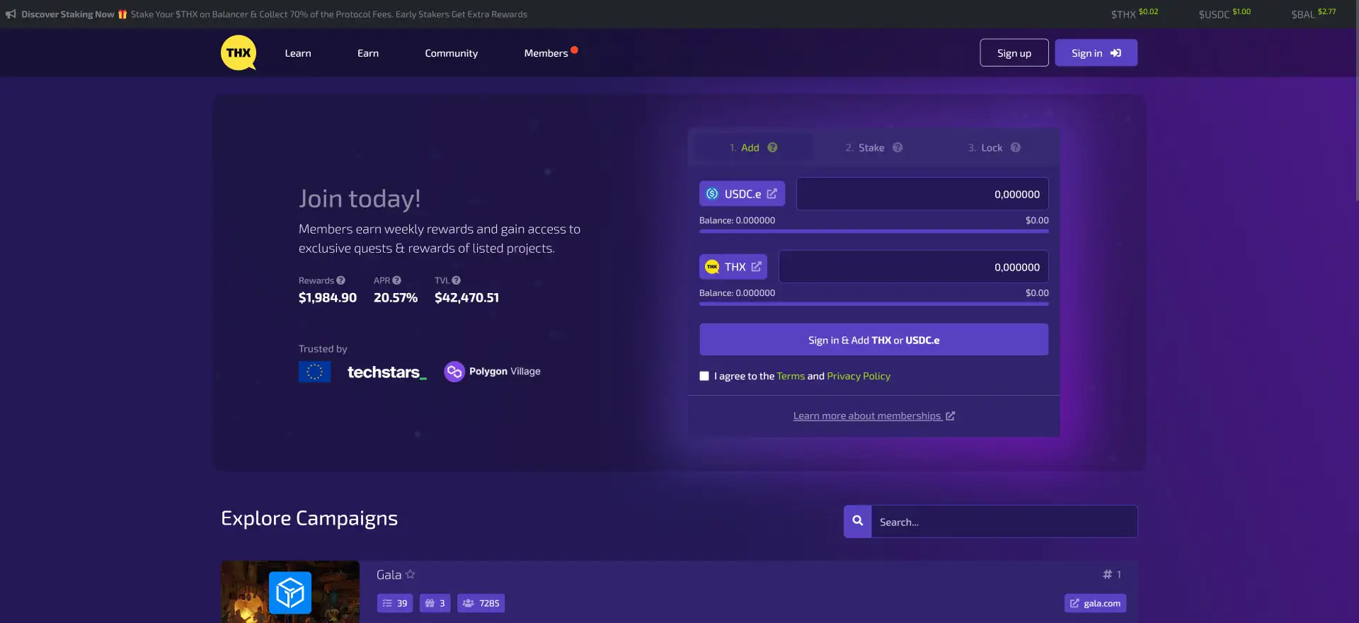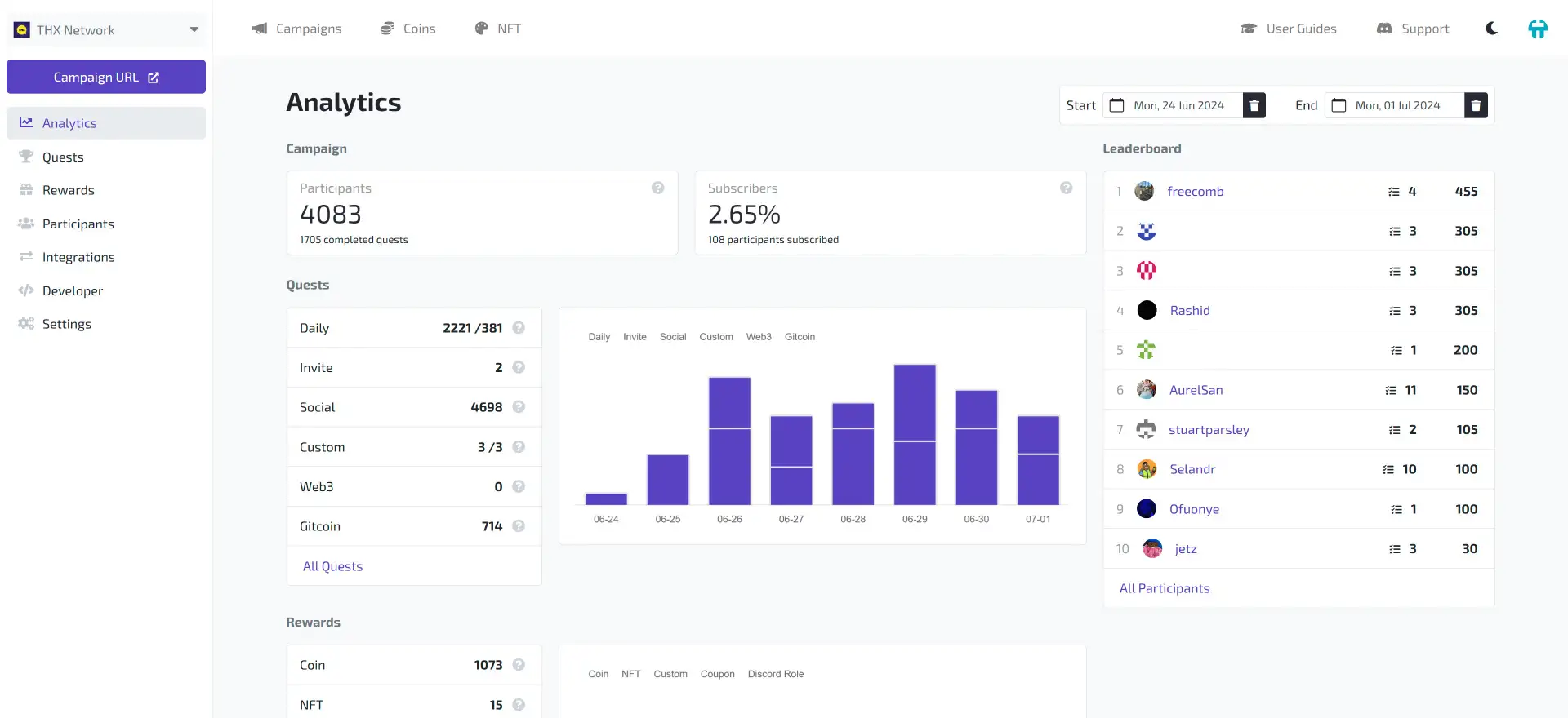 - Earn and Stake THX Tokens: After your reward program is live, users can begin earning THX tokens based on the activities you’ve set up. You can also stake your own THX tokens within the platform to earn additional yield, adding another layer of value to your participation.