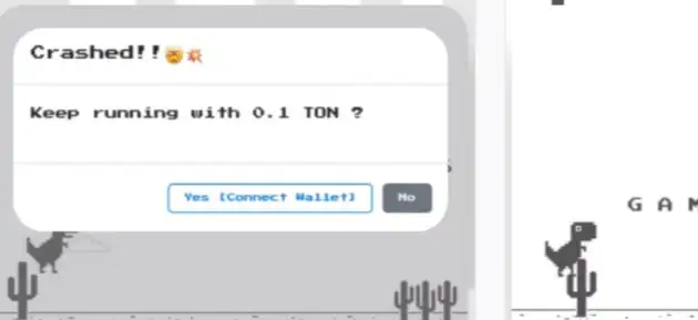 - Using TON Tokens: If your dino crashes, the game will offer you the option to continue by paying 0.1 TON tokens. To do this, you’ll need to connect your TON wallet. You’ll be prompted to confirm your payment to revive the dino and continue your run.