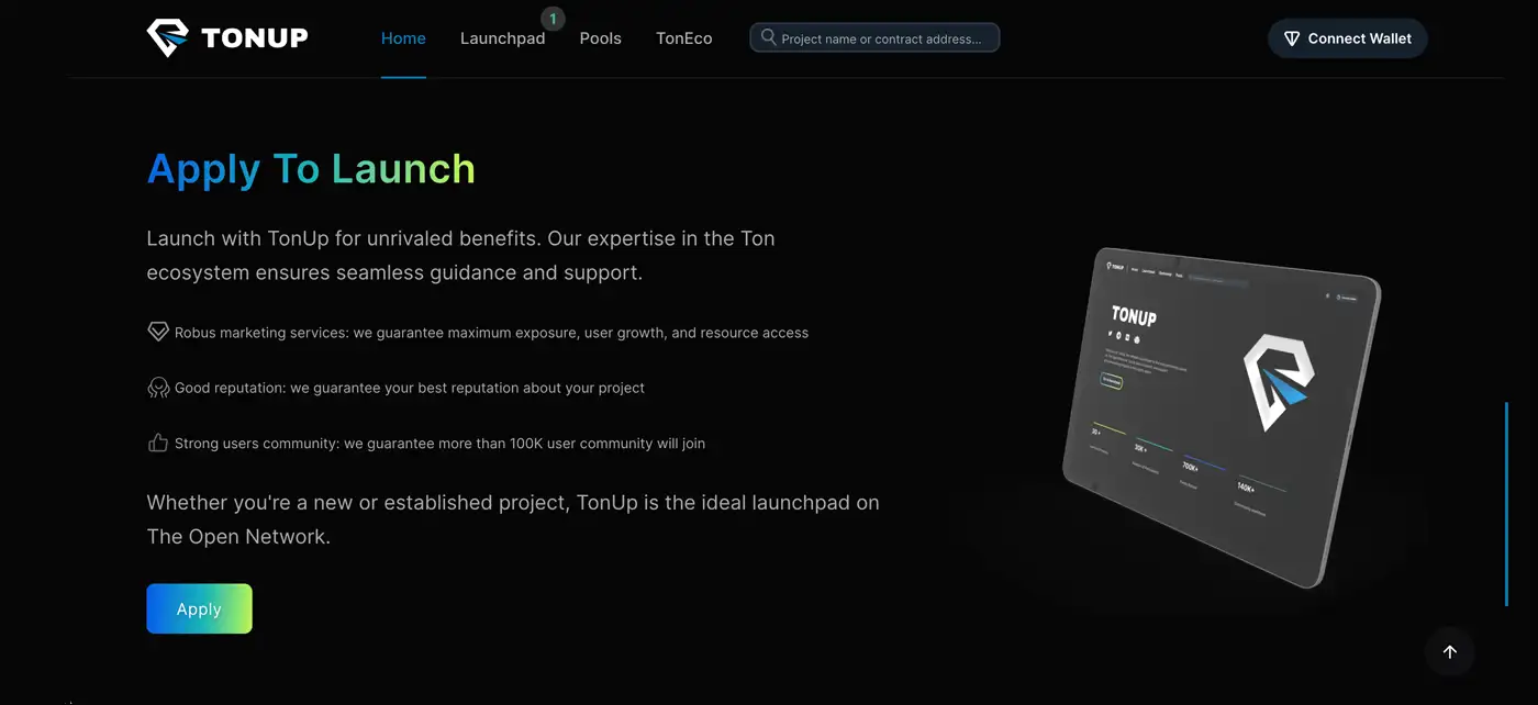 TonUP serves as a gateway for new and existing projects within The Open Network (TON) ecosystem, offering a comprehensive suite of services that include funding opportunities, strategic partnerships, and a supportive community. The platform is built to assist projects at various stages of development, from initial concept to full-scale launch.