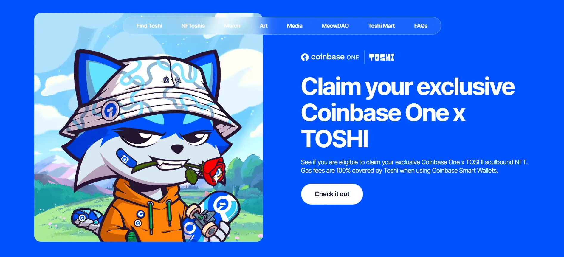 To stay true to its identity as "The Face of Base", Toshi has partnered with Coinbase Smart Wallet to onboard new users with zero friction. When claiming exclusive NFTs, like the Coinbase One x Toshi soulbound NFT, Toshi the Cat covers gas fees completely. This initiative isn’t just cute — it’s strategic, helping Toshi grow adoption while lowering entry barriers to crypto.