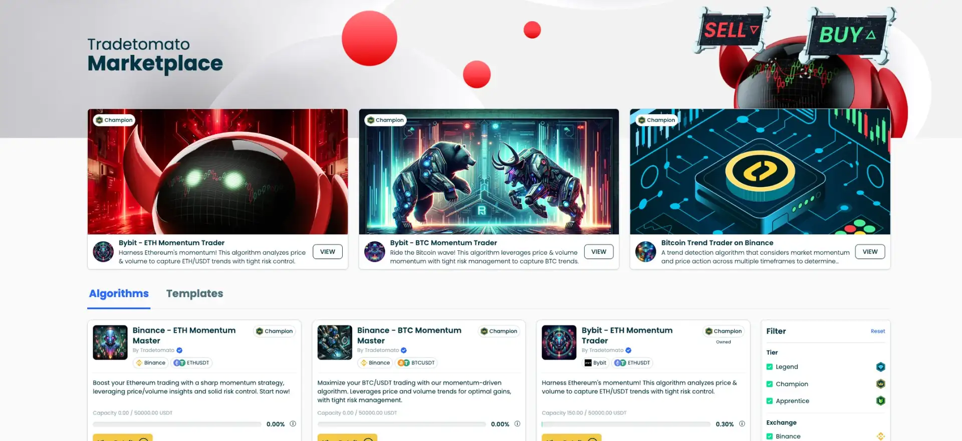 In addition, Tradetomato offers a vibrant marketplace where users can access a wide range of play & play algorithms, templates, and much more. These algorithms allow users to easily get started with automated trading, without the need for technical expertise. The platform's focus on user-centric design and continuous innovation positions it as a leader in the crypto trading automation space.
