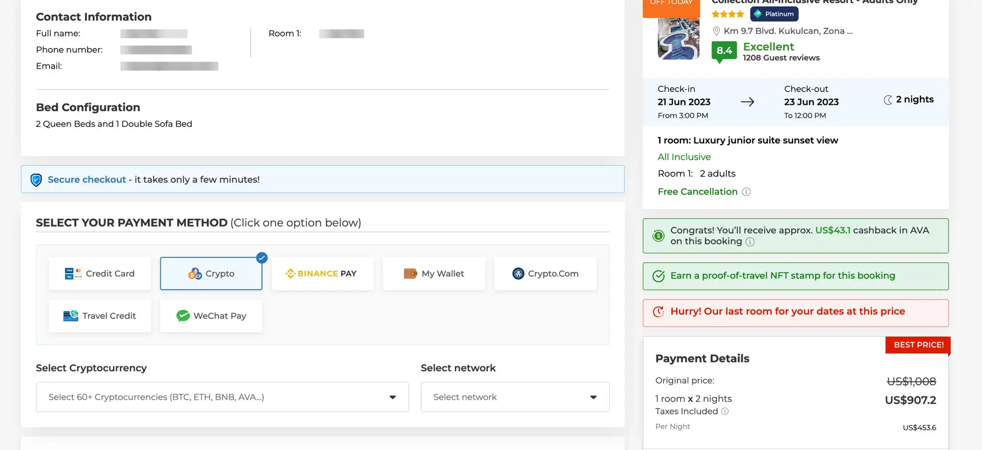 - Crypto Payment Options: Accepts over 100 cryptocurrencies, including Bitcoin, Ethereum, and AVA.