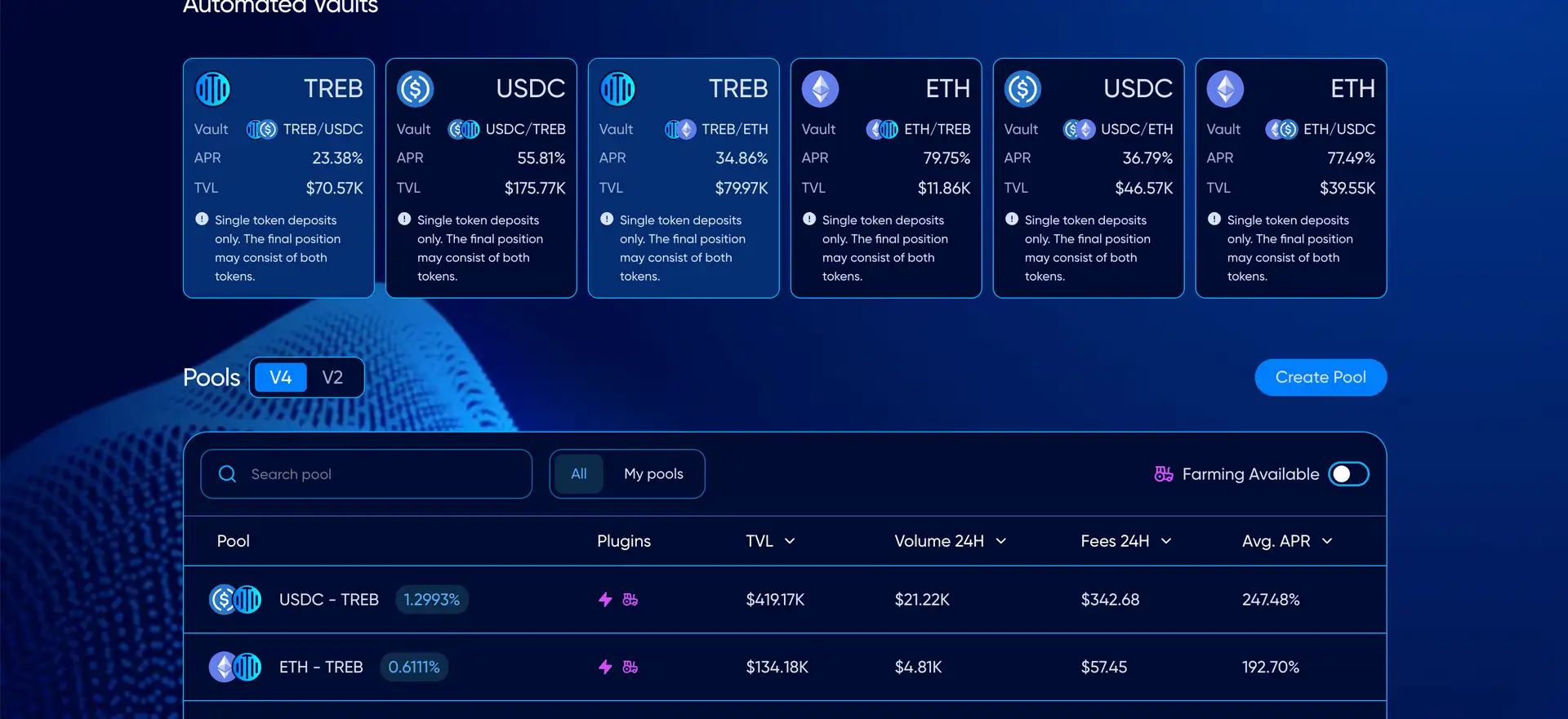 Treble provides an extensive set of DeFi tools and features tailored to enhance user experience, maximize capital efficiency, and encourage long-term participation: