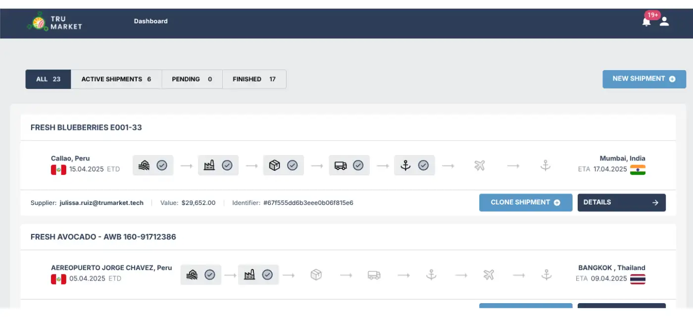 TruMarket is a platform that allows liquidity providers to finance verified agricultural exports. By contributing capital in dollars (USDC) to TruMarket's financing pool, investors enable these operations to be executed securely while earning attractive returns.