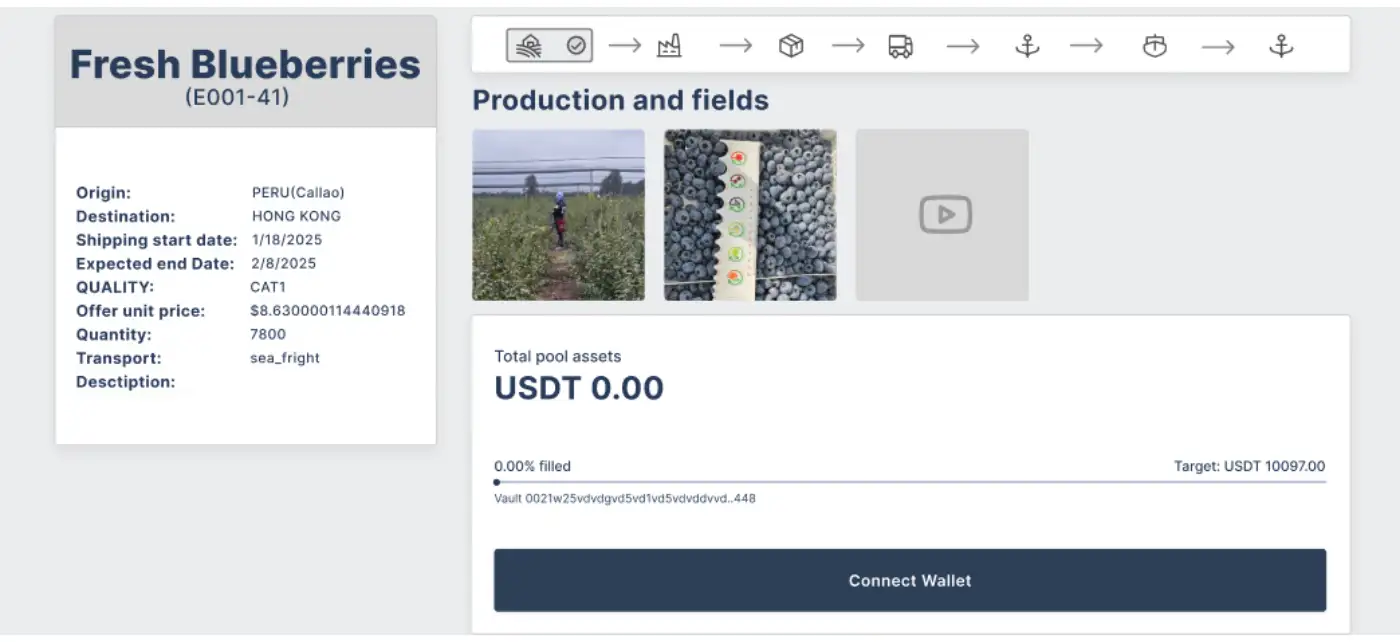 - Asset Tokenization: Agricultural commodities (coffee, berries, avocados, etc.) are tokenized as verifiable digital assets.
