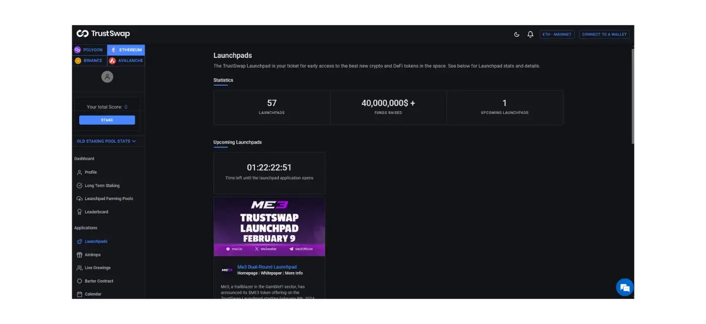 - Access the TrustSwap dashboard by logging into your account. Here, you can explore various services such as staking, token creation, and launchpad participation.