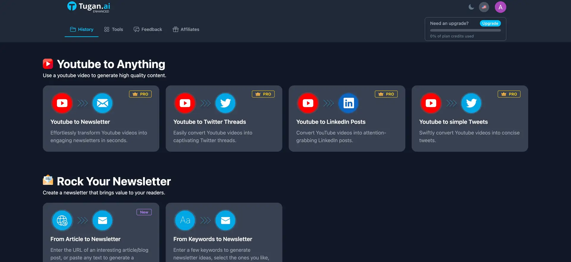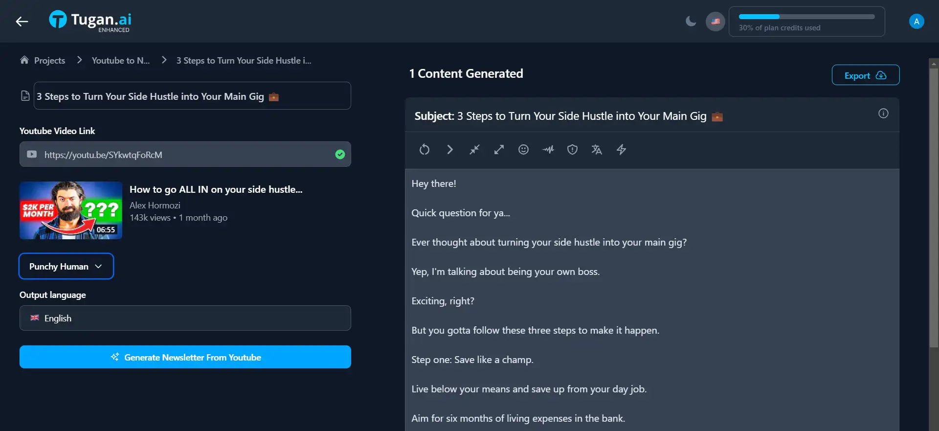 Tugan.ai can transform various types of content, including YouTube videos, articles, and websites, into fresh and unique material.