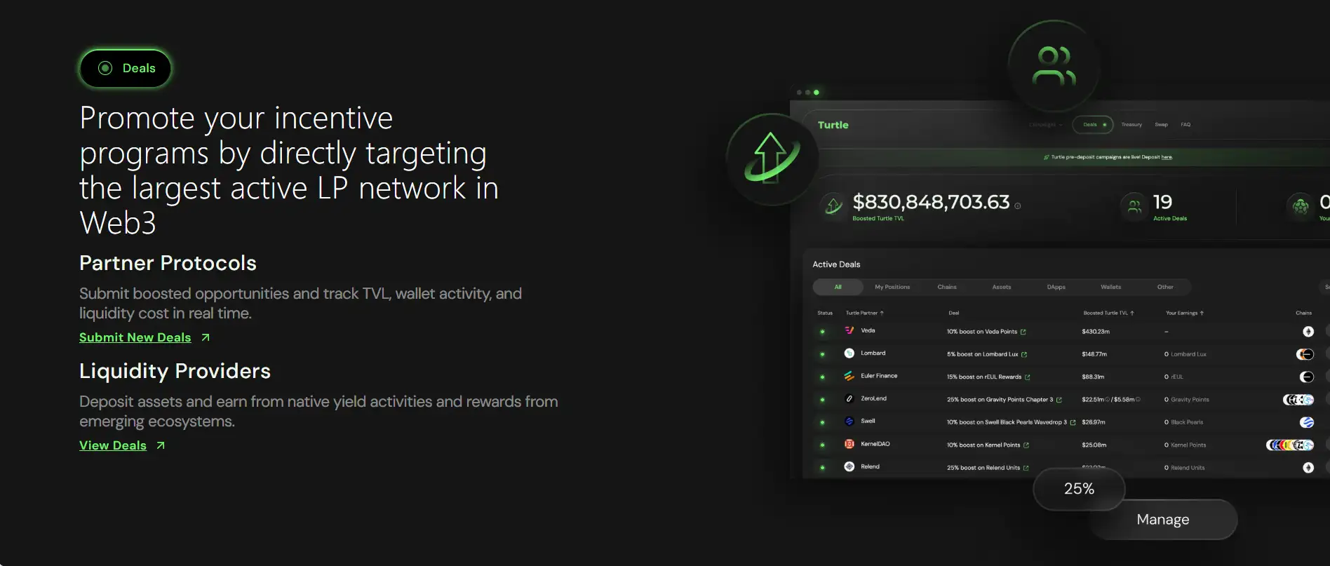 The protocol enables three main roles: Liquidity Providers, who can register their wallets and earn rewards by continuing their regular activities on partner protocols; Protocols, who use Turtle’s network and analytics to attract liquidity more efficiently; and Distribution Partners, who embed Turtle deals into their communities and frontends to generate revenue through affiliate activity. Integration is flexible via widgets, APIs, or SDKs.