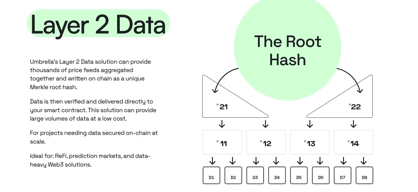 Umbrella Network's layer 2 solution processes data off-chain, allowing for high throughput and thousands of transactions per second. This significantly enhances scalability compared to traditional on-chain oracle solutions.