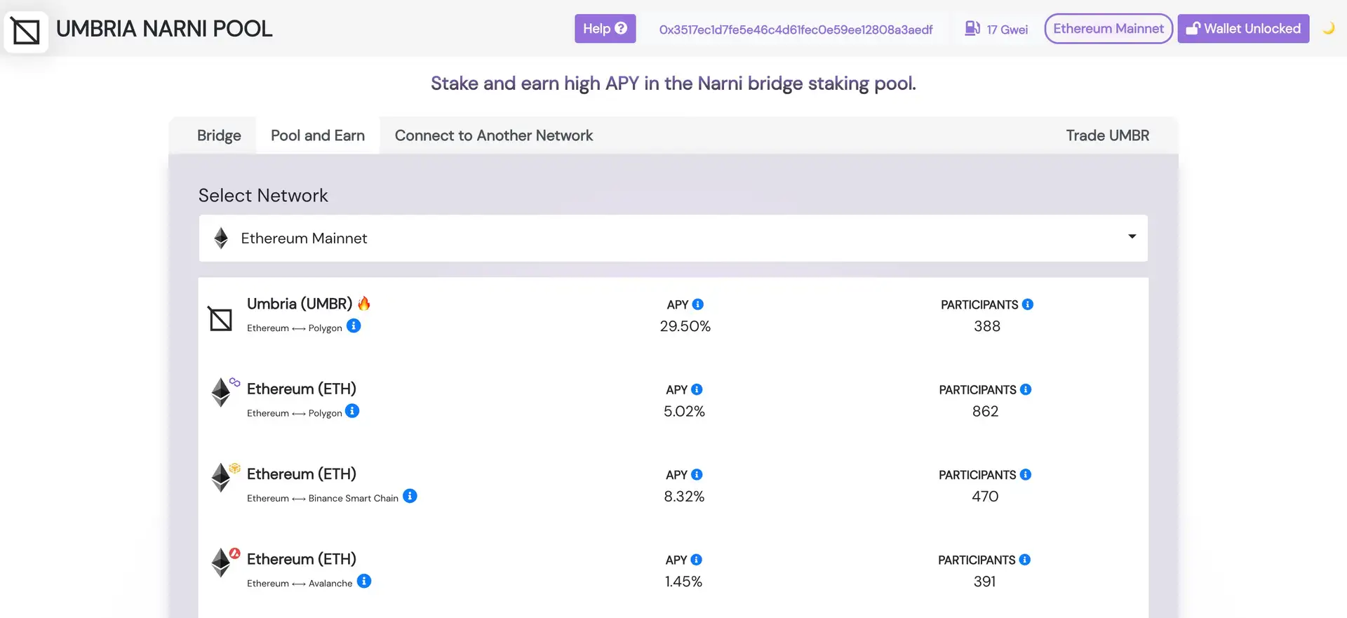 In addition to staking, UMBR tokens can be used for governance, allowing holders to propose and vote on important changes within the Umbria ecosystem. They can also be utilized to pay for transaction fees, particularly when using the Narni Bridge for cross-chain transfers.