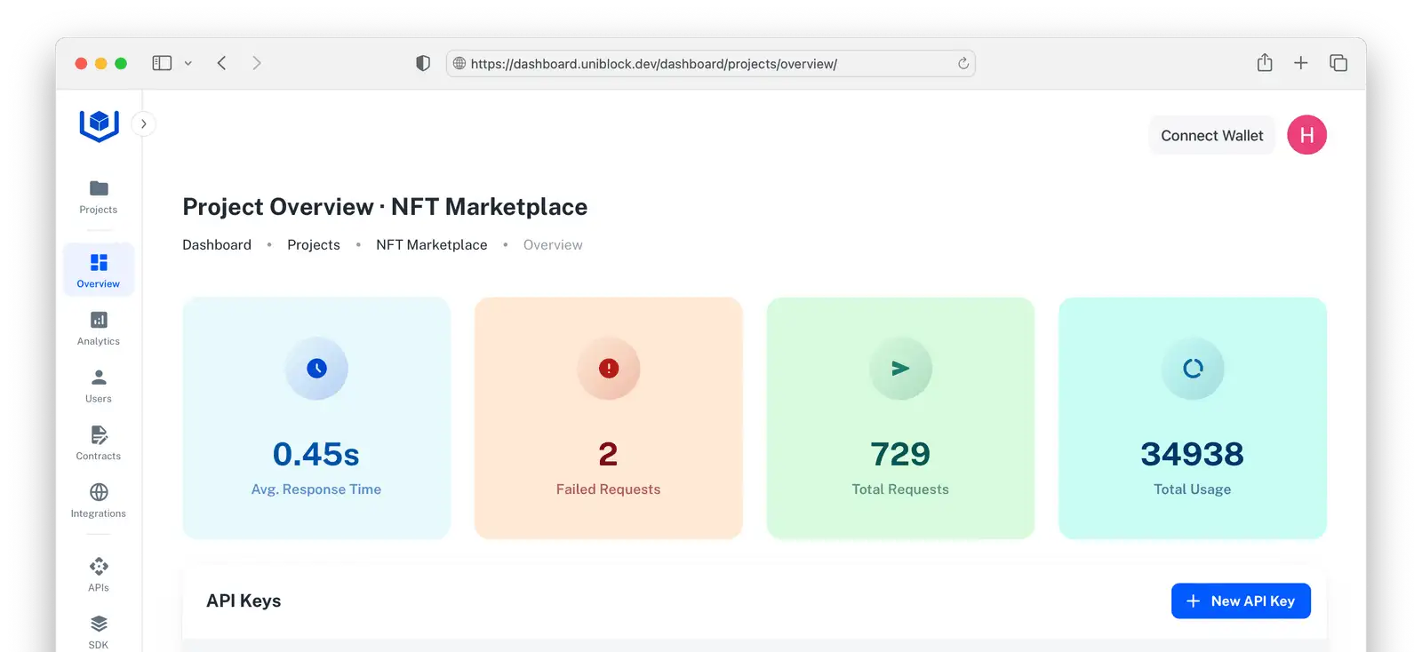 - User-Friendly Interface and Support: Uniblock provides a user-friendly dashboard and comprehensive documentation that make it easy for developers to integrate and manage APIs. Additionally, the platform offers responsive support to assist developers with any issues that arise during development.