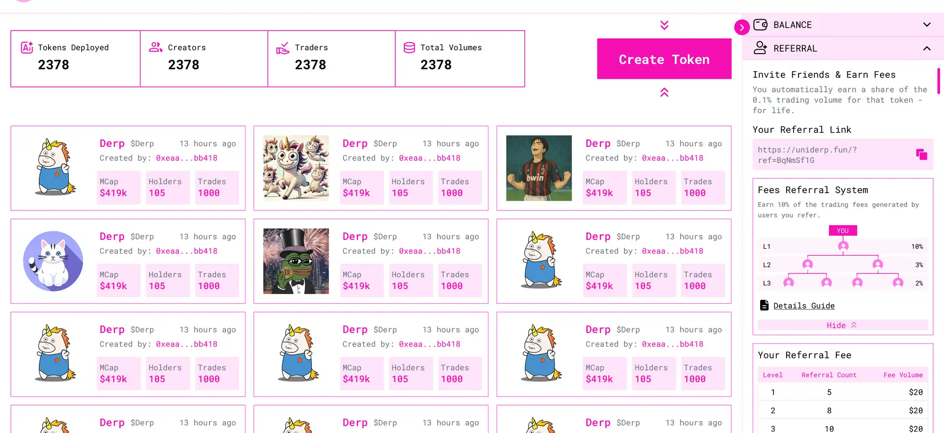 Absolutely. UniDerp.Fun features a 3-level referral system where you can earn up to 15% of the platform fees for tokens launched and traded through your referral link. Rewards are paid automatically via the Uniswap V4 Hook smart contracts and require zero maintenance. Your friends create chaos — you get paid. Learn how it works at UniDerp.Fun.
