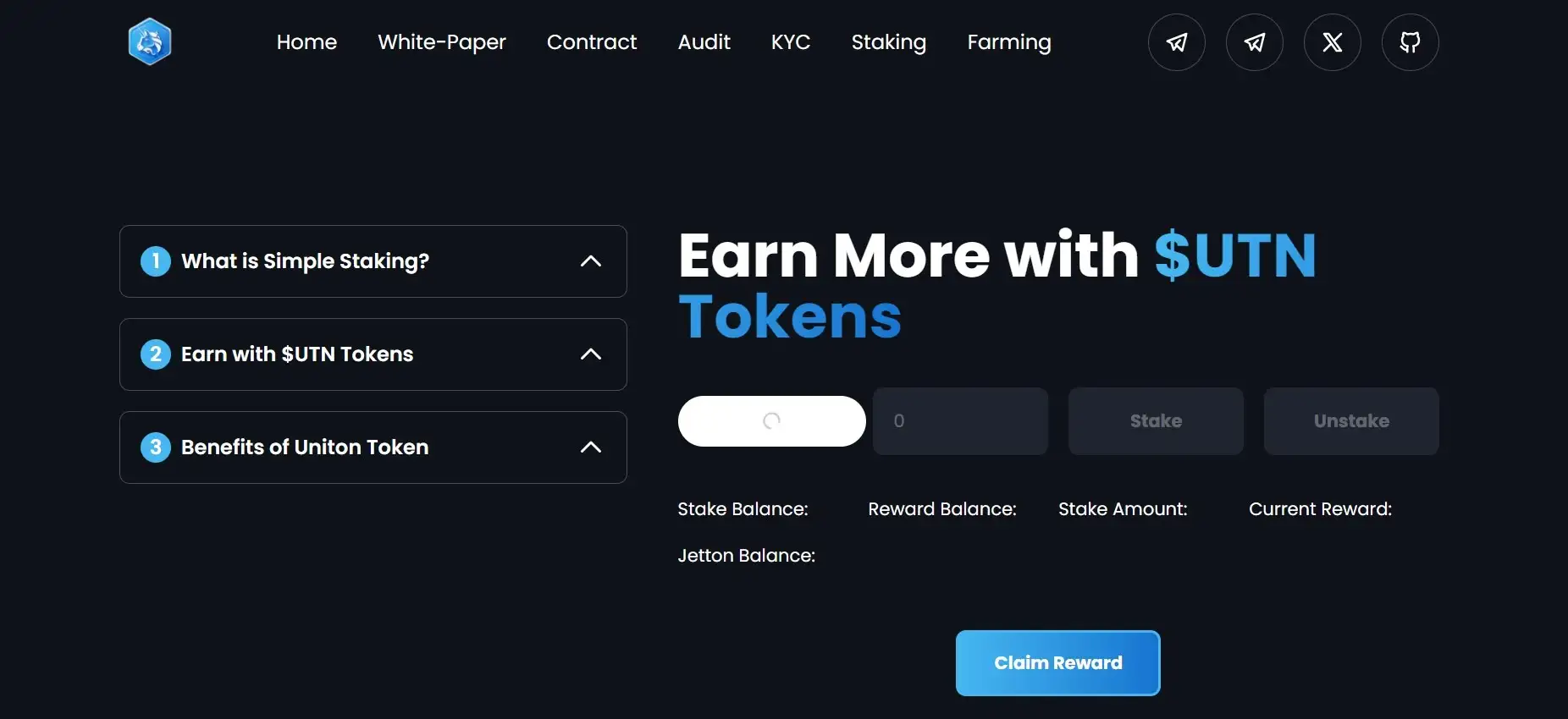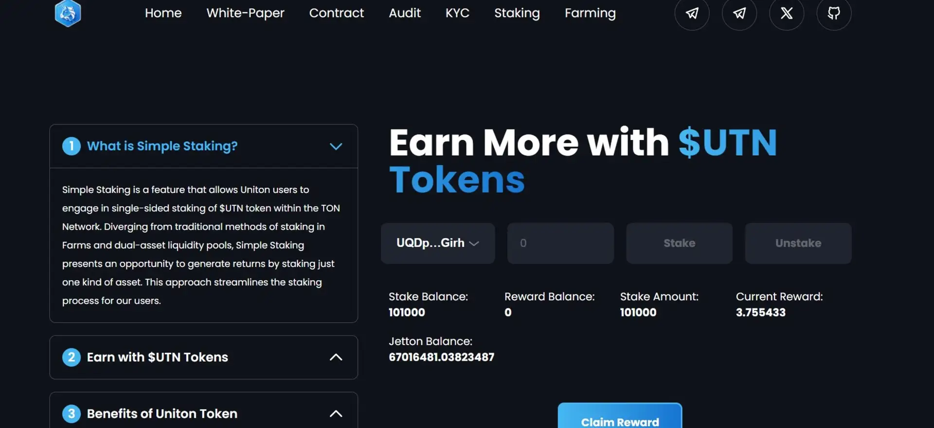 - Staking and Farming: Uniton offers advanced staking and farming features, which reward users for holding tokens and participating in the ecosystem, helping to stabilize the token's value.