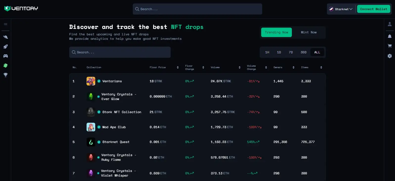 Ventory offers a comprehensive suite of analytics tools that provide detailed metrics such as floor price changes, volume changes, and ownership statistics. Its user-friendly interface and real-time data tracking ensure that users have the most up-to-date information at their fingertips, setting it apart from other platforms.