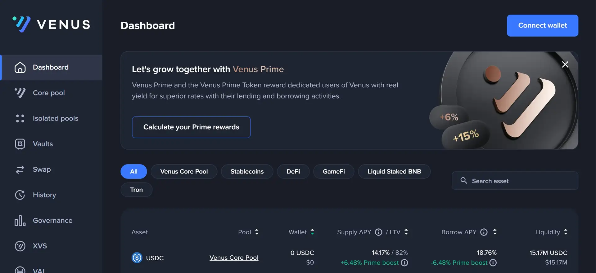 - Monitor your positions and manage your assets through the Venus Protocol dashboard.
