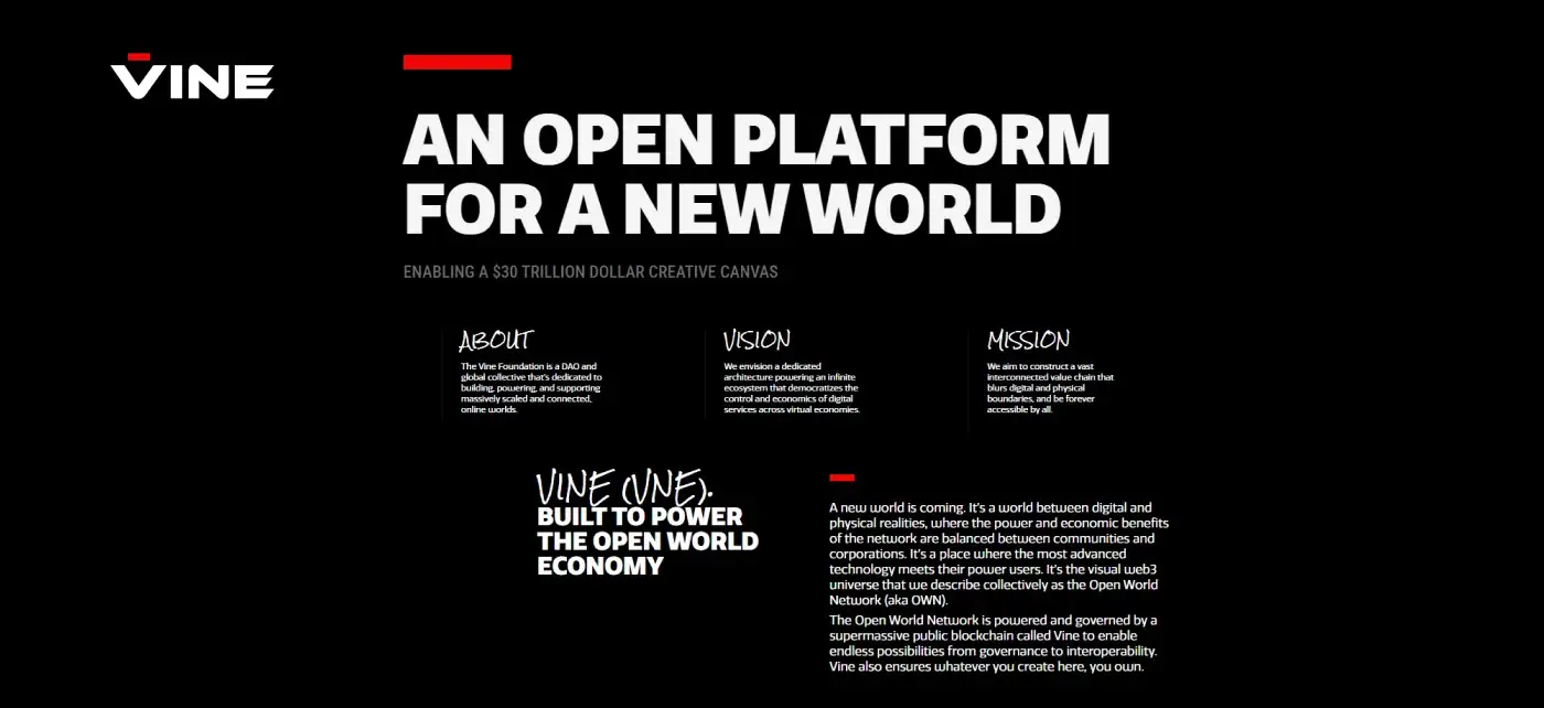 Vine DAO is an innovative Decentralized Autonomous Organization (DAO) focused on revolutionizing digital interaction through the creation of the Open World Network (OWN). This visionary platform, inspired by the metaverse concept from popular culture like "Ready Player One," aims to integrate blockchain technology and generative AI to build a fully decentralized and immersive virtual world. Vine DAO's mission is to create an inclusive ecosystem that empowers users and organizations to shape their digital destinies in a user-centric, community-driven environment.