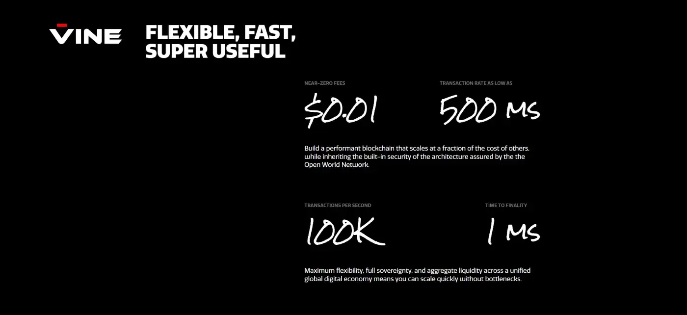 - Scalability: Vine’s network architecture is engineered to handle high transaction volumes both on-chain and cross-chain, ensuring that the platform can support a growing number of users and activities without slowdowns or bottlenecks, making it ideal for a dynamic and expanding digital economy.