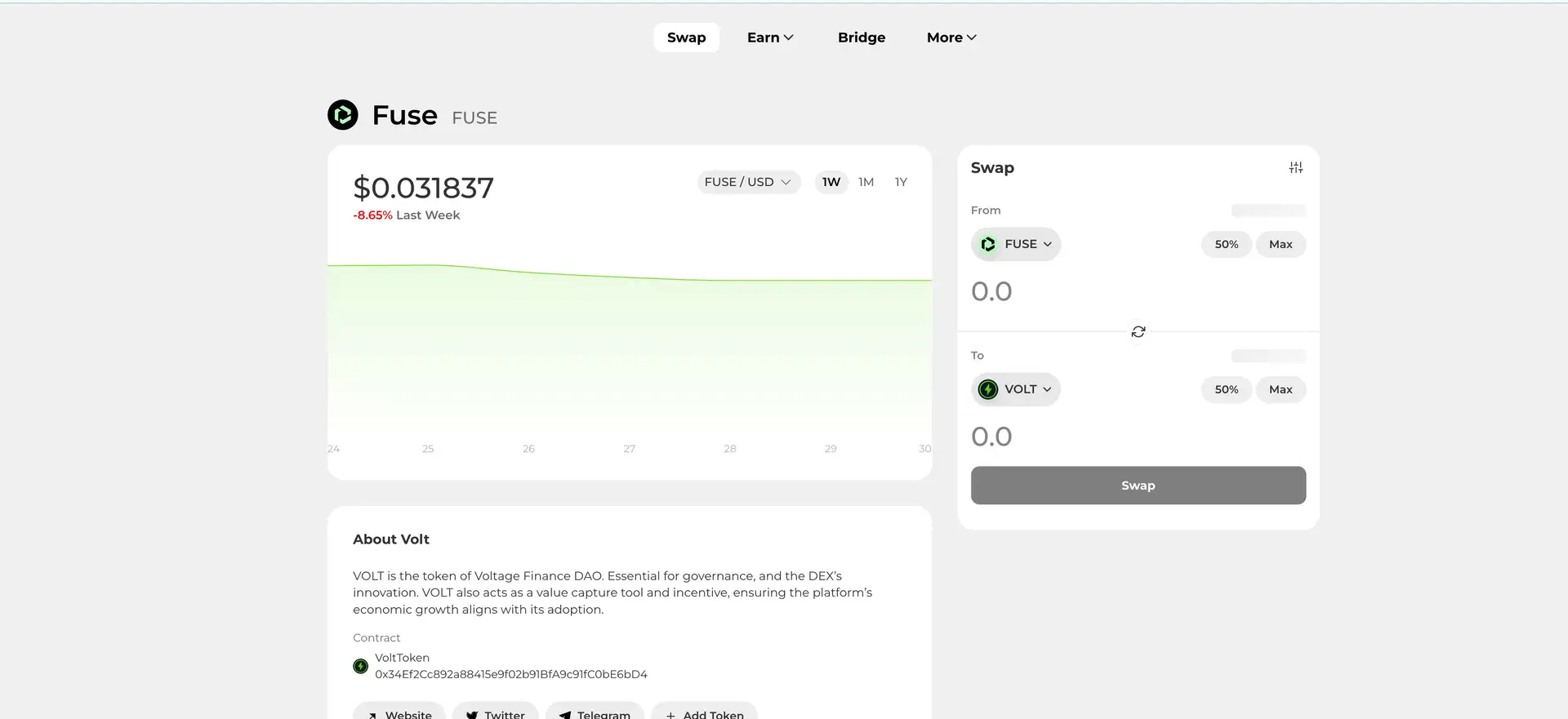 Voltage Finance is a decentralized exchange (DEX) and automated market maker (AMM) that operates on the Fuse Network. The project’s primary mission is to provide a seamless DeFi experience that is accessible to both seasoned users and newcomers. By leveraging the Fuse Network’s low fees and fast transaction times, Voltage Finance aims to remove barriers to entry for decentralized finance, offering tools that allow users to swap, stake, and farm tokens with minimal friction.