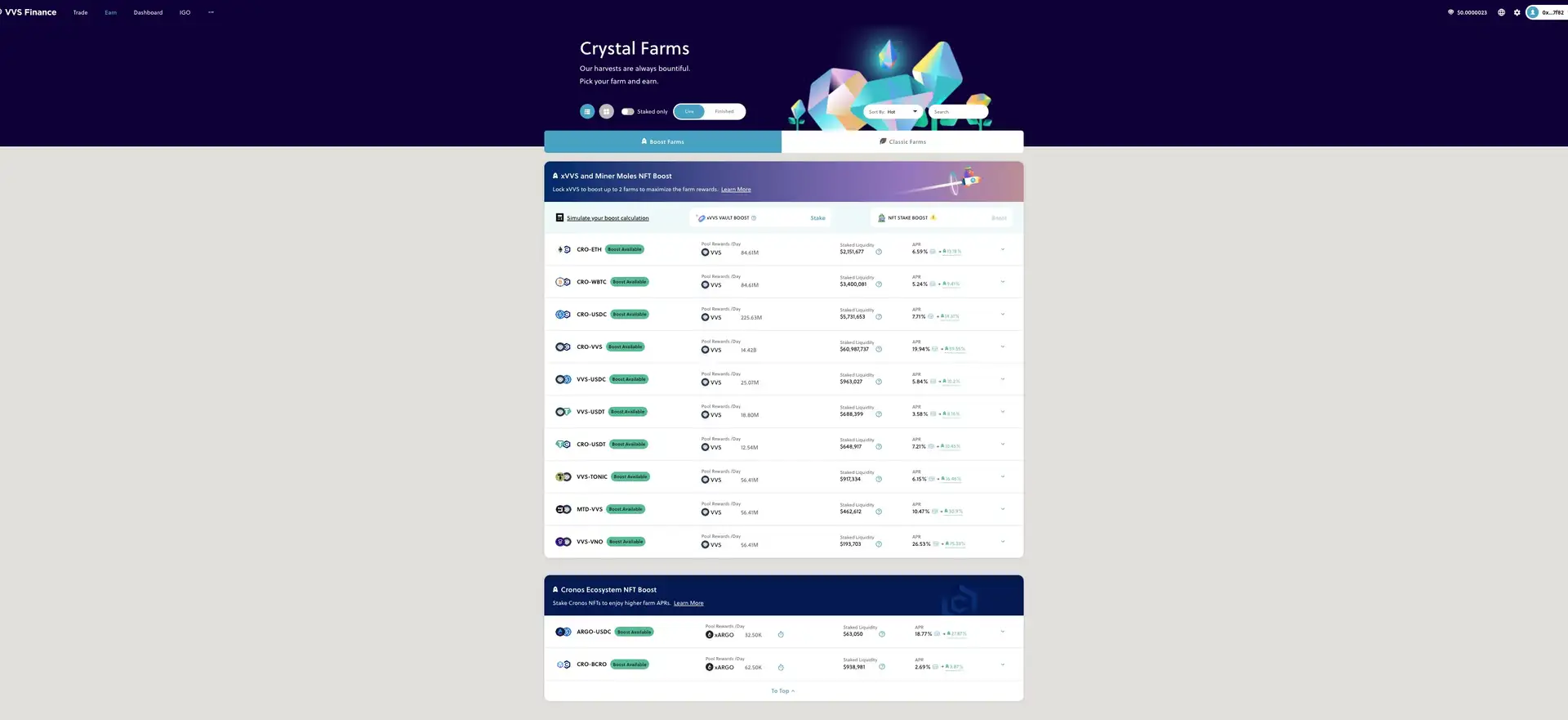 - Staking Programs: VVS Finance offers a variety of staking options with attractive rewards. Users can stake their VVS Tokens in different pools, each offering varying rates of return based on the staking period and amount staked.