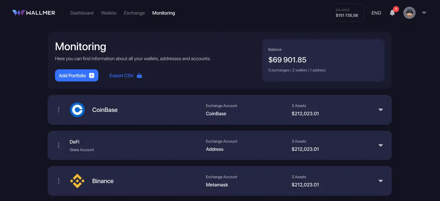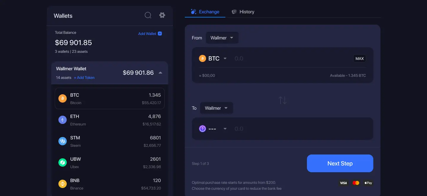- Monitor & Trade: Connect your exchanges or wallets to the Wallmer portfolio tracker for real-time monitoring of your assets. Use the integrated exchange service to trade cryptocurrencies directly within the platform.