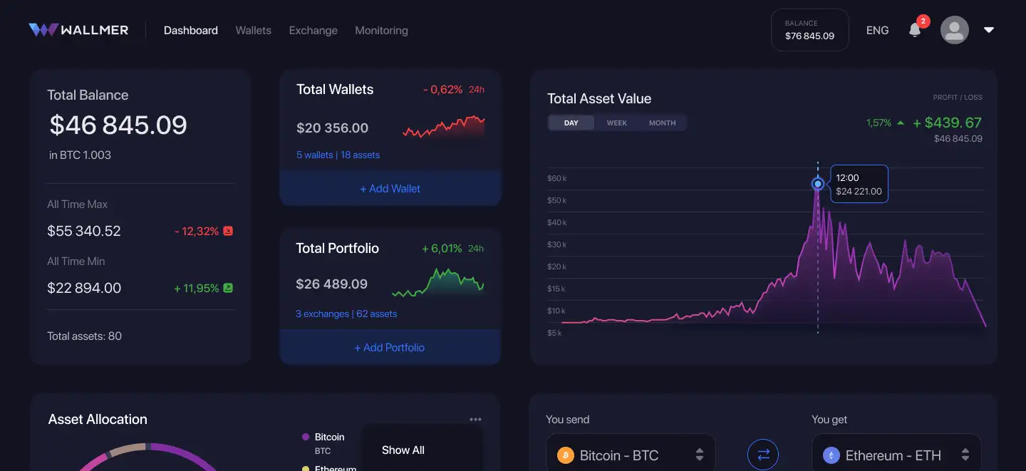- Wallmer Dashboard: Customizable widgets that display real-time crypto metrics, allowing users to visualize their performance with charts and graphs. The dashboard helps users identify trends and measure their efficiency.