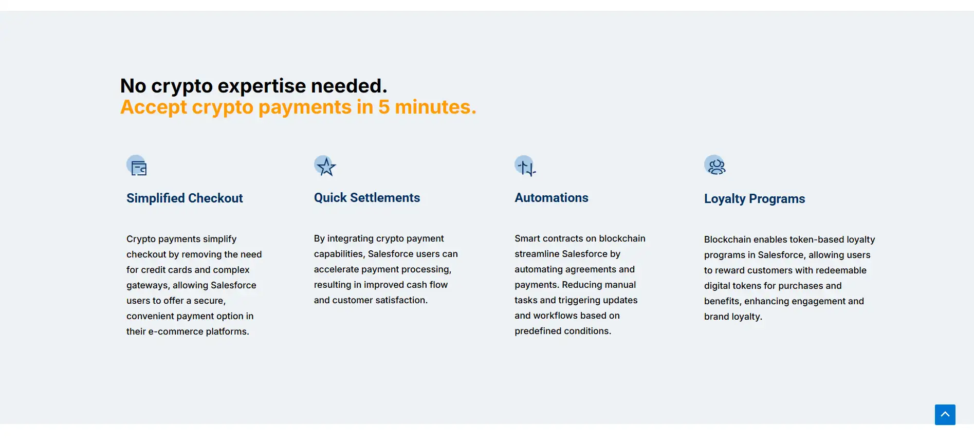 - Seamless Salesforce Integration: Fully native to Salesforce, enabling workflow automation, compliance tracking, and real-time updates based on crypto transactions.
