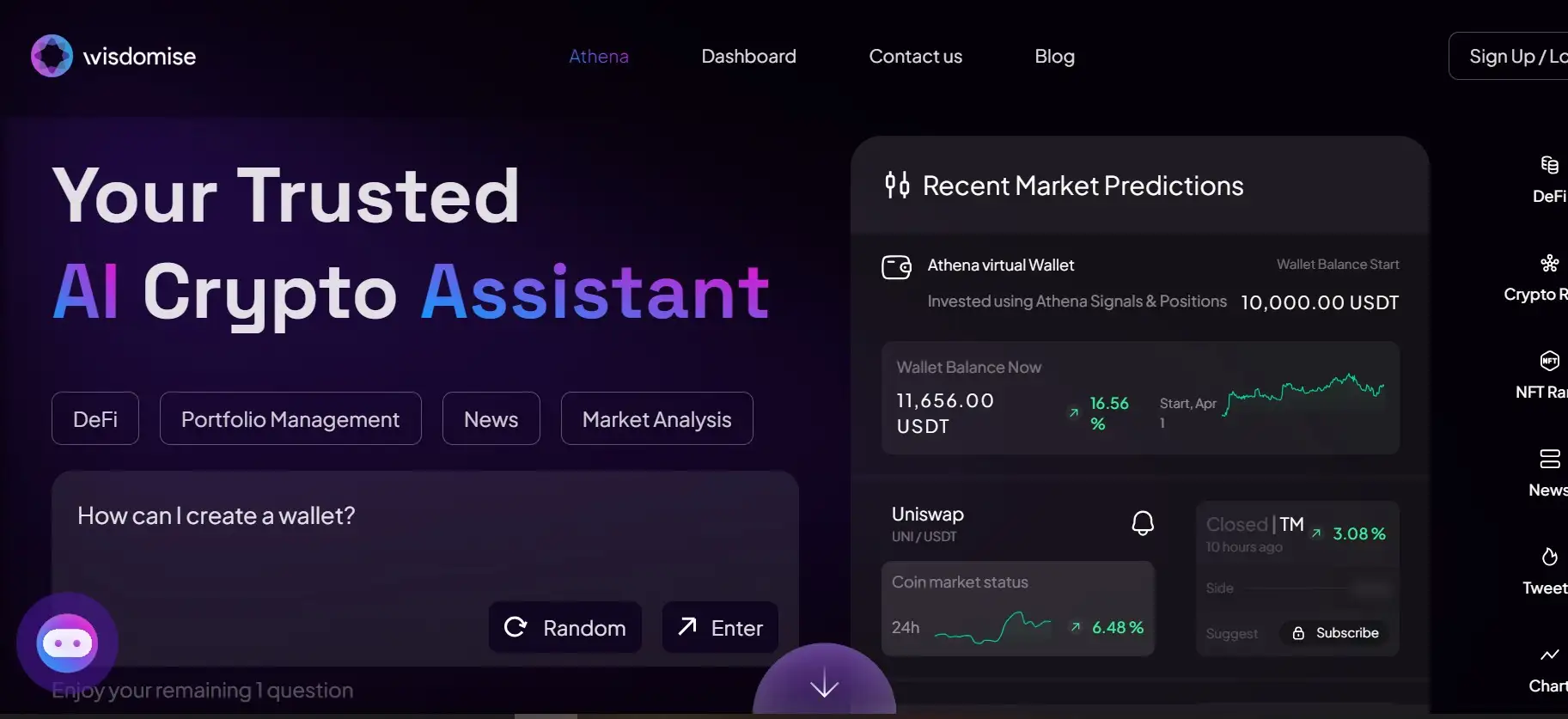 Wisdomise is an AI-driven crypto trading and insights platform designed to leverage artificial intelligence for optimizing cryptocurrency investments. The project aims to democratize access to sophisticated trading tools and market insights, making advanced strategies accessible to traders of all levels. Wisdomise provides automated trading, real-time signals, and personalized guidance through its AI chatbot, Athena. The mission is to empower users to navigate the complex crypto market with confidence and precision.
