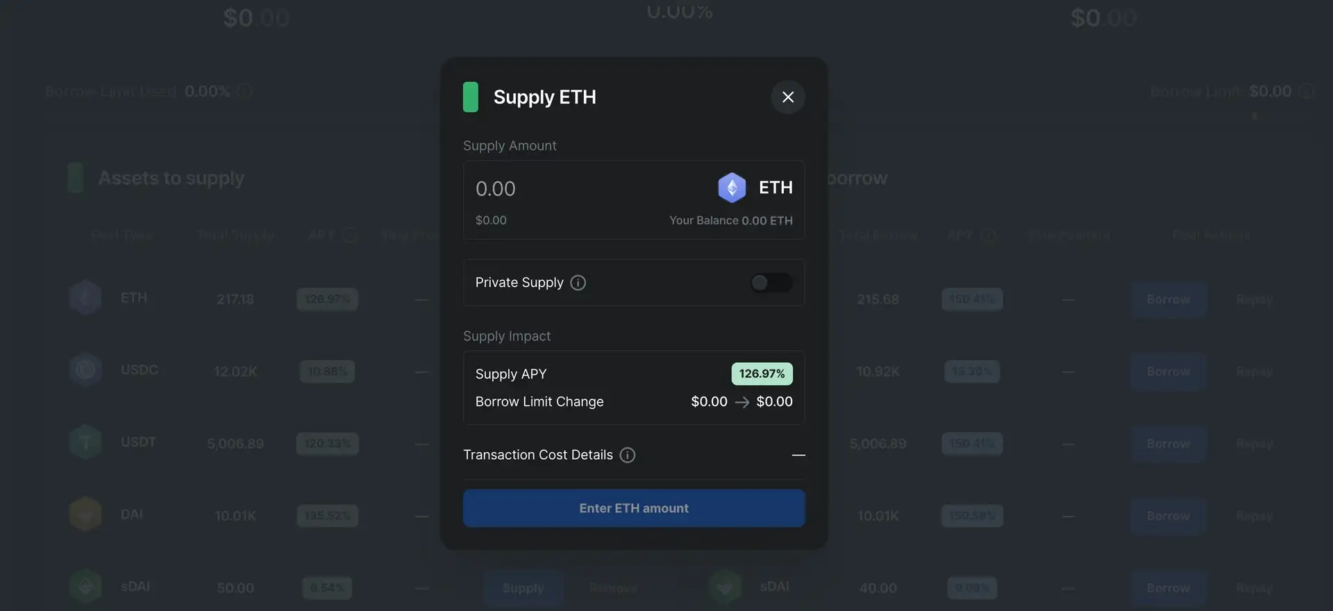 Choose your preferred crypto assets from a wide selection and deposit them into the lending pools. The platform supports major cryptocurrencies like BTC, ETH, and various ERC-20 tokens.