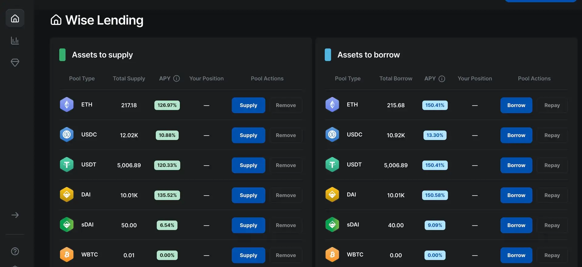 - High APYs: Wise Lending offers competitive annual percentage yields for lenders by integrating with top DeFi yield sources. This ensures that users can maximize their returns on deposited assets.