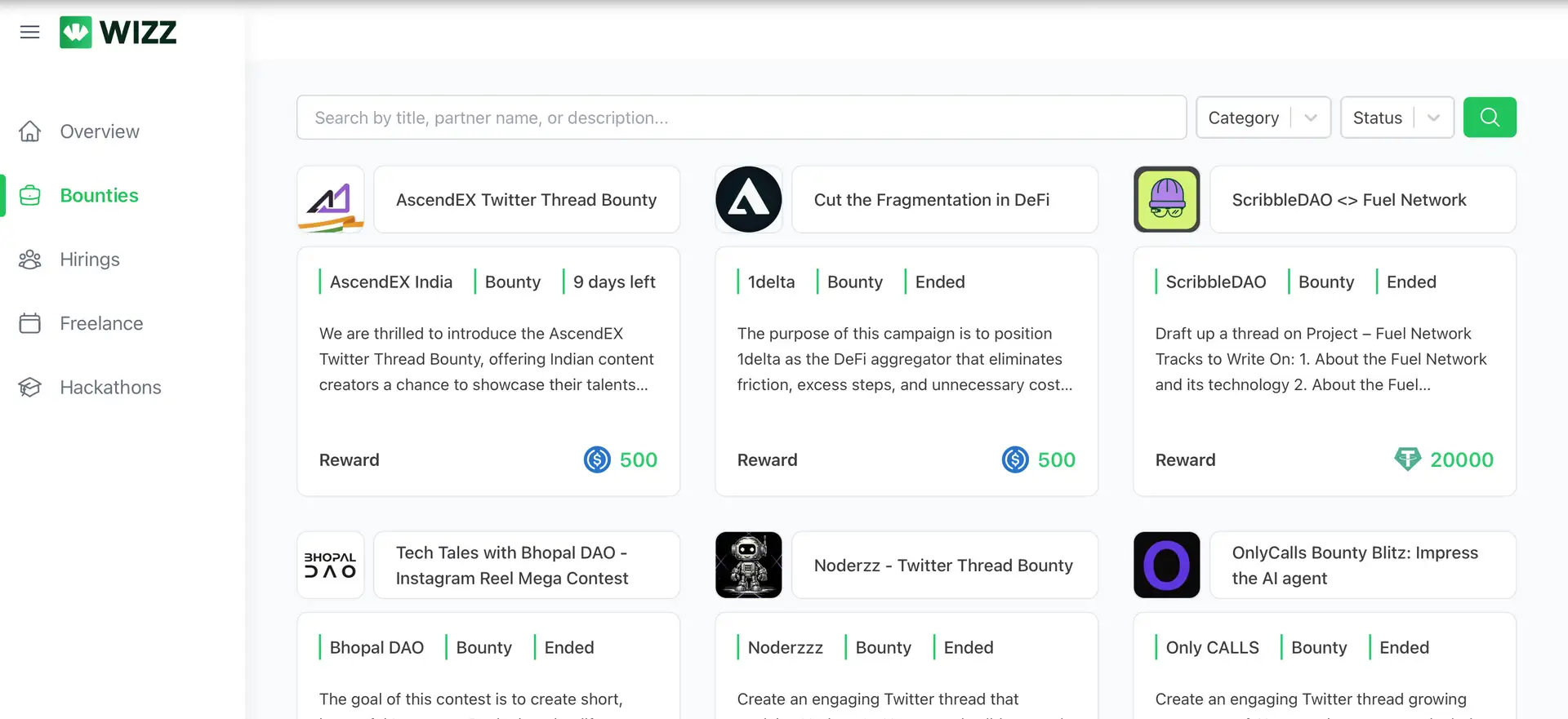 - Step 1: Visit the Platform: Go to wizzhq.xyz and click on “Bounties,” “Hirings,” or “Freelance” to explore active listings.