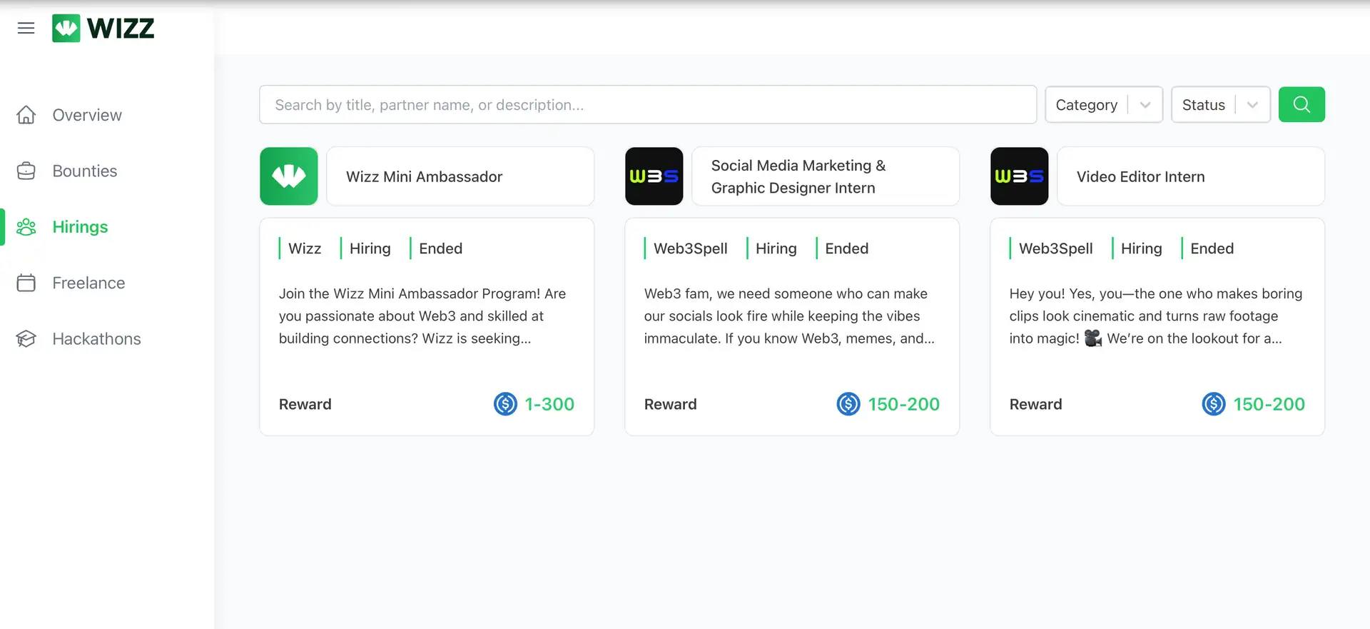 Beyond bounties, Wizz also features a Hiring section for longer-term roles and internships. Examples include graphic design and video editing gigs from projects like Web3Spell, as well as ambassadorship programs designed to onboard new partners to the platform. This flexible system allows both individuals and startups to grow together, creating a feedback loop of trust, incentives, and execution.