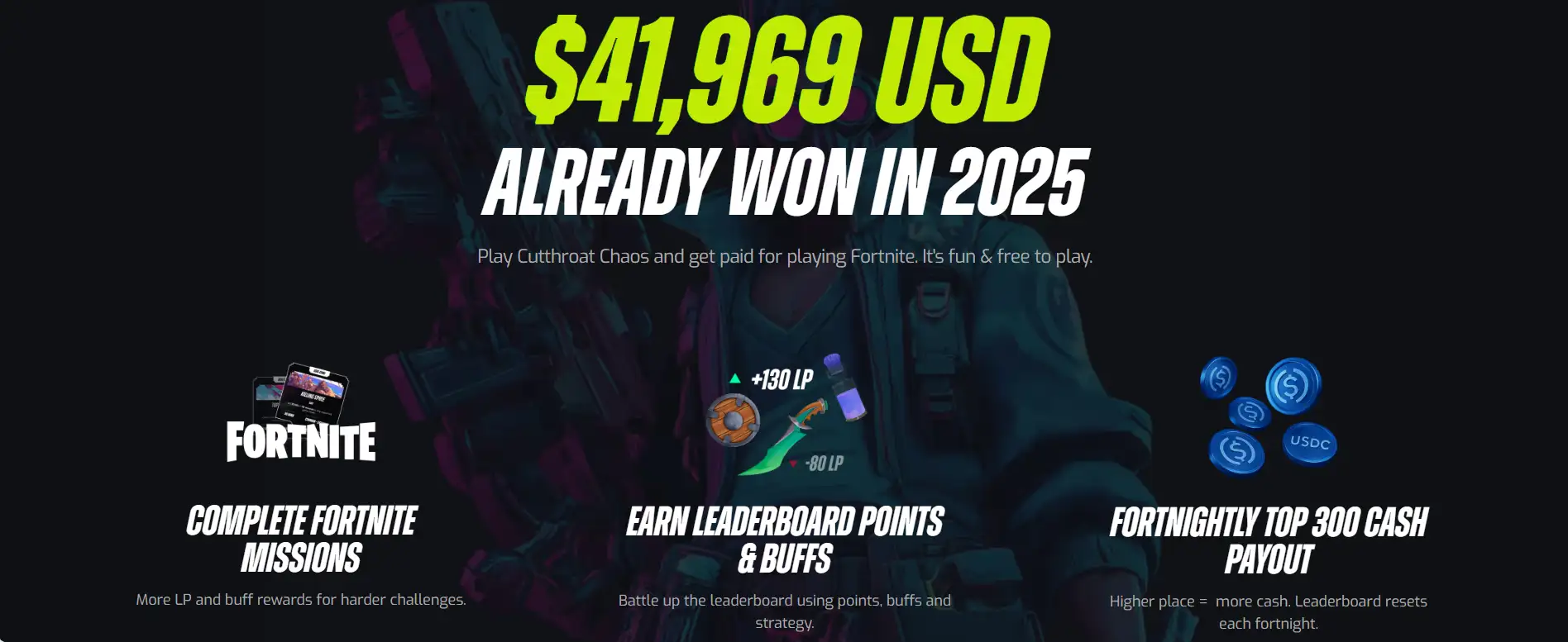 XP.GG reimagines competitive gaming by rewarding Fortnite players with real cash payouts based on their in-game performance. Its core offering, Cutthroat Chaos, is a strategic PvP leaderboard tournament that operates on a fortnightly basis. Every two weeks, players complete Fortnite missions to earn Leaderboard Points (LP) and compete for a share of a $1,000 prize pool, with payouts delivered in USDC to the top 300 players.