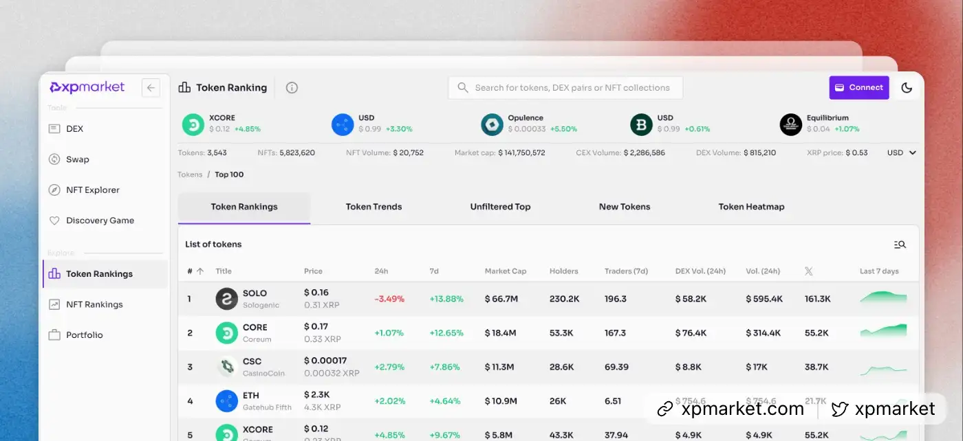 - Comprehensive XRPL Data Aggregation: XPMarket tracks a wide range of metrics related to XRPL tokens, including price, volume, market cap, trust lines, and wallet holders, providing a holistic view of the XRPL ecosystem.