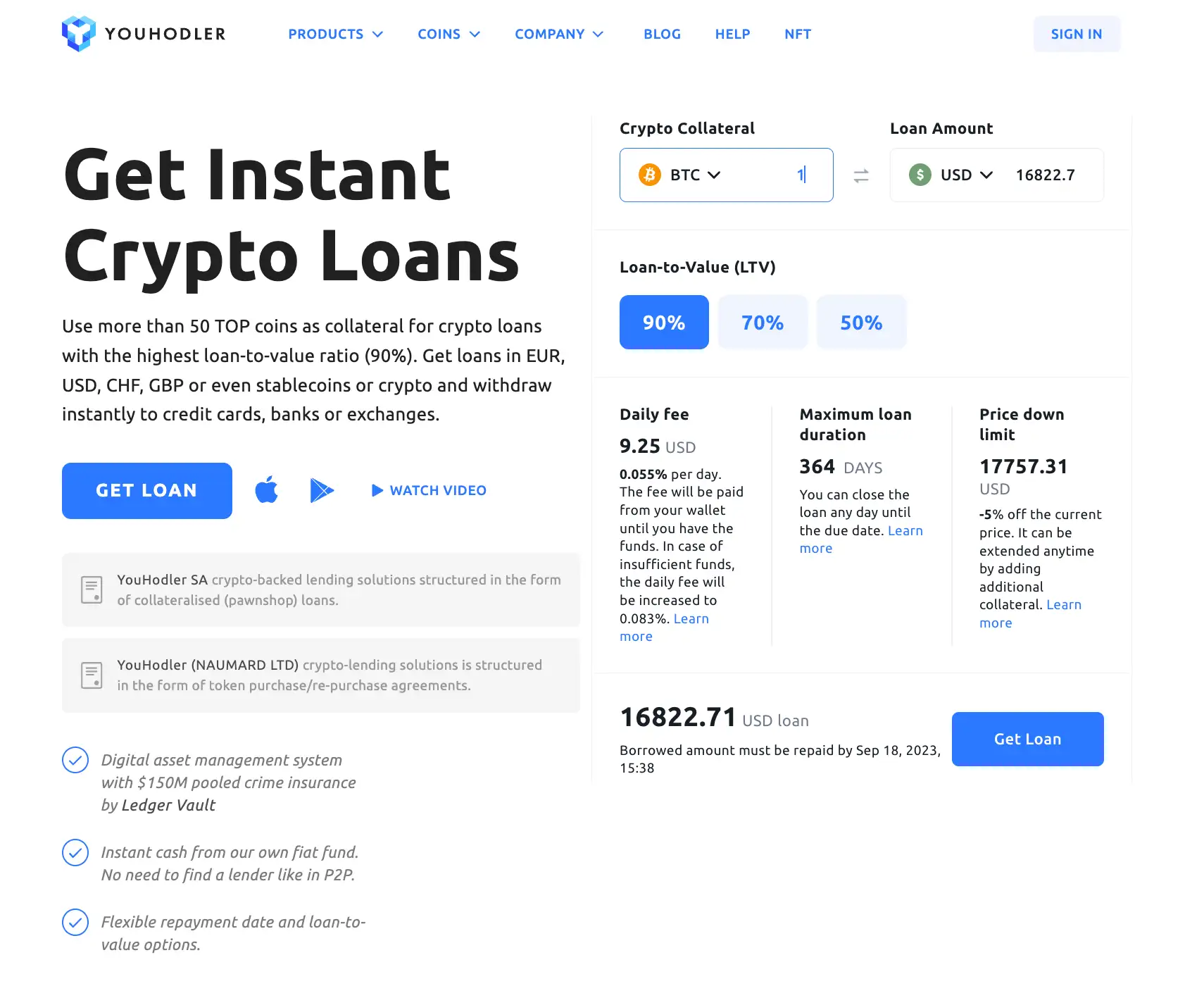 You can use your crypto assets as collateral by taking out a crypto-backed loan on YouHodler app. This allows you to borrow fiat currency while retaining ownership of your crypto, which remains in your account and is returned once the loan is repaid.