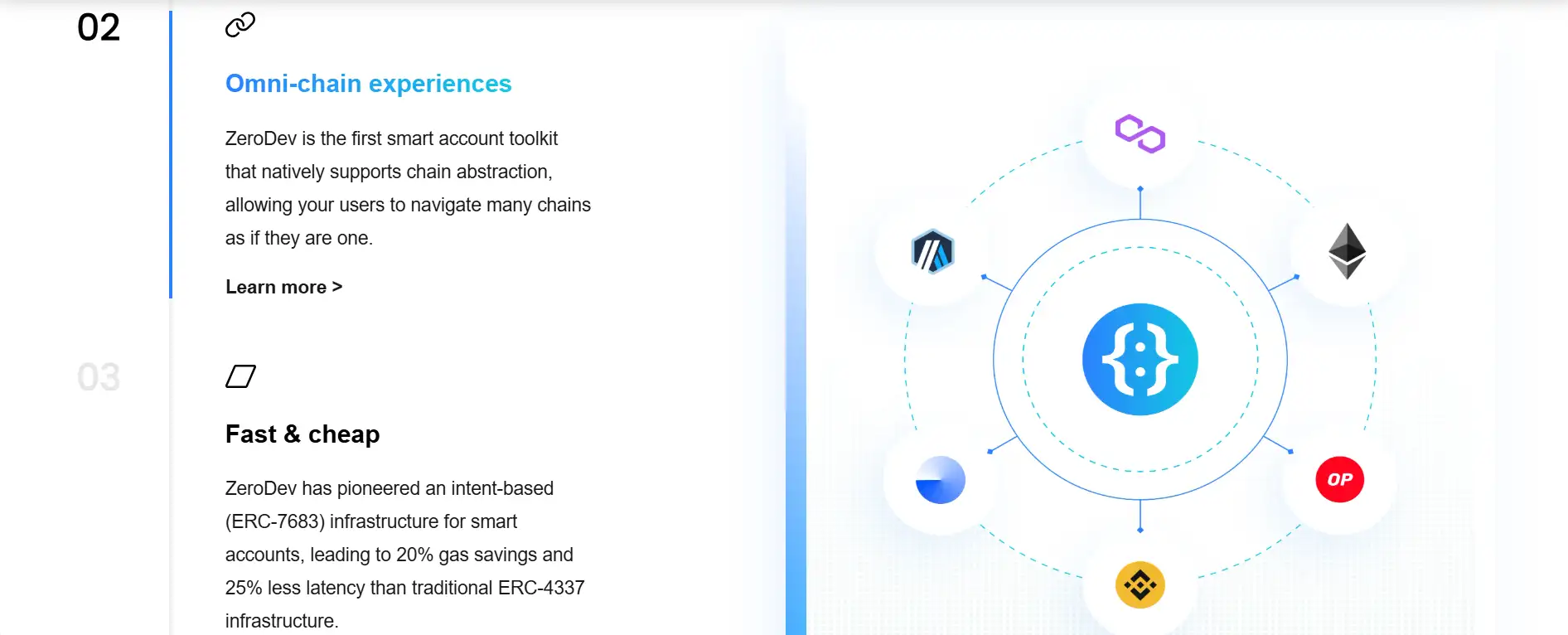One of the standout capabilities of ZeroDev is its native support for chain abstraction. This means users can interact with multiple chains as if they were one, removing the need for bridges or network switches. This is a game-changer for building omni-chain applications and vastly improves the user experience. In addition, ZeroDev's infrastructure leverages ERC-7683 (intent-based architecture), which results in around 20% gas savings and 25% lower latency when compared to conventional ERC-4337 solutions. These optimizations make ZeroDev ideal for performance-sensitive applications like real-time gaming, DeFi platforms, and AI integrations.